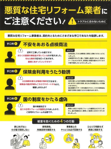 不安をあおる点検や、保険金・補助金を口実にした強引な勧誘には十分ご注意ください。