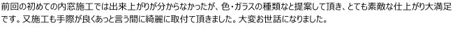 2025.10.03前回の初めての内窓施工では出来上がりが分からなかったが、色・ガラスの種類など提案して頂き、とても素敵な仕上がり大満足です。又施工も手際良くあっと言う間に綺麗に取付て頂きました。大変お世話になりました。 『担当より』 昨年に続き、LIXILインプラス窓の設置のお依頼ありがとうございました。寒い冬での断熱効果など、またお声を聞かせて下さい。お困り事などいつでもお気軽にご連絡ください。